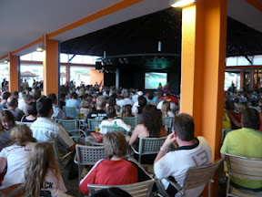 Ziemlich witzig, dass links die daitschen Fans und vor der rechten Leinwand die türkischen Fans postiert sind. Zwischen den Wänden, die Partybühne mit Animateur, bah.