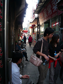 Wir kommen in die frisch renovierten (abgerissen und neu gebauten) Hutongs (Gassen), zunächst in eine Breitere mit vielen Restaurants, solche zum reingehen und am Tisch sitzen. Vor jedem stehen eine Menge Leute (alle Schlitzaugen) Schlange. Aus einem Fenster werden fertig gebratene Enten in großen durchsichtigen Plastiktüten verkauft. Sehen die lecker aus! Haben langsam etwas Hunger, aber 1h anstehen, das wollen wir nicht. Wir müssen uns bewegen, nach der langen Reise. Meine Beine fühlen sich doppelt so dick an, und meine Knöchel kann ich kaum noch erkennen. Brauche dringend solche Stewardessen-Kniestrümpfe mit Kompressionsfunktion, das ist ja doof, jedesmal nach nem längeren Flug drei Tage oder so ohne Knöchel rumlaufen zu müssen.