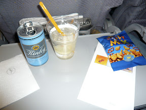 Wenn man statt O-Saft oder Wasser einen Gin Tonic bestellt fliegt sich's einfach netter. (Ich reise ja fast immer im Billigflieger oder Kurzstrecke, da gibt's nie Coktails! LH rockt.) Die Stewardess meint es dann auch noch richtig gut mit uns, und der erste Schluck haut mich fast um. Also immer ein bisschen abschlürfen, dann Tonic nachleeren. Magisches Grinsen setzt zum ersten Mal auf dieser Reise ein.