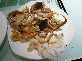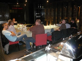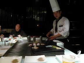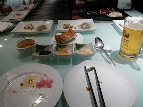 Es gibt all-you-can-eat-Buffet mit kalten und warmen Sachen und Bier in großen Krügen (gezapft). Wir bestellen auch noch verschiedene Dinge von der heissen Platte, die uns der Koch am Tisch zubereitet.